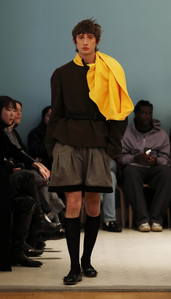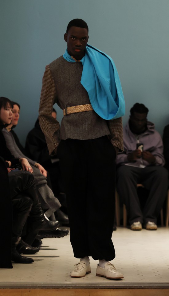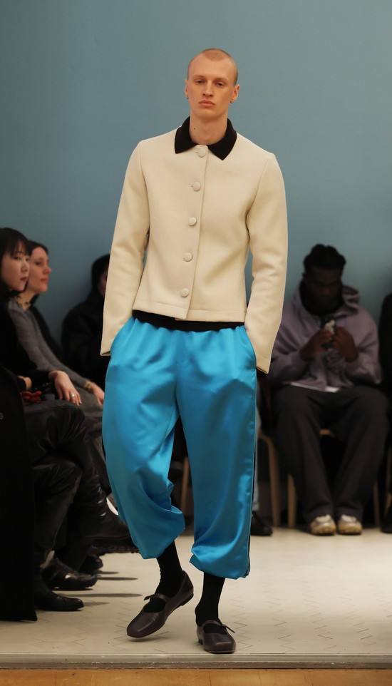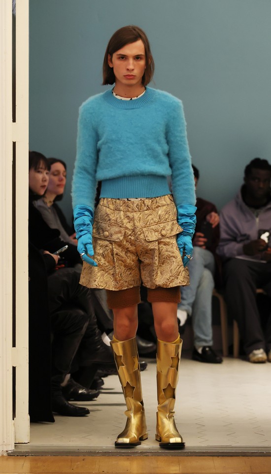 Er eröffnet sich mit dieser Kollektion einen weiterentwickelten Ansatz, sich mit Konstruktion und Gestaltung auseinanderzusetzen und seine Ideen zum Ausdruck zu bringen. Geschickt werden die Bezüge der einzelnen Stücke der Kollektion herausgearbeitet und dargestellt. So kommt es zu schönen Kontrastpaaren, etwa einer kurzen Damen-Couture-Jacke mit einer A-Silhouette in goldenem, griffig strukturiertem Brokat mit hellblauem Kragen und einem passenden Herrenlook mit goldener Short und fluffigem hellblauen Herrenpullover.