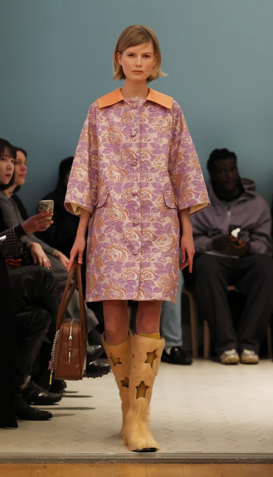 Der Designer scheut sich nicht, sehr mutig mit kontrastierenden Materialien zu experimentieren. Neben Brokat, Jacquard und Strick finden sich auch Textilien wieder, die aus dem Bereich der Heimtextilien kommen und eher bei warmen Stoffdecken verortet werden oder an die Taktilität von Plüschtieren erinnern.