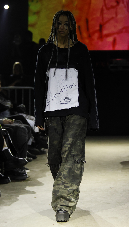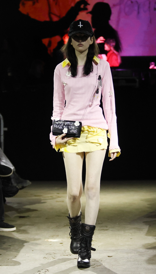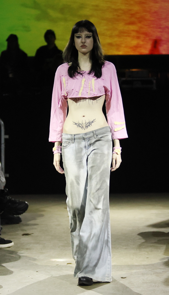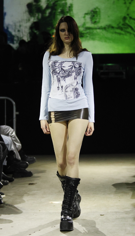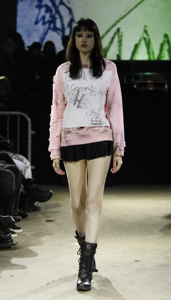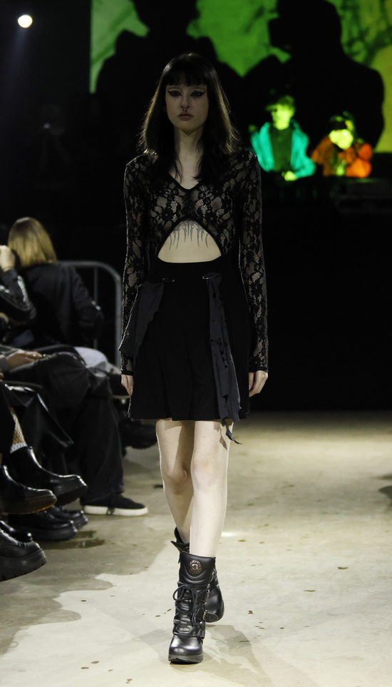 Die Entwürfe sind geprägt von applizierten Flächen mit Statement-Skizzen auf Tops bis hin zum Katzenbild, schimmernd metallischen Jacken, auch bauchfrei, und vielen schweren Stiefeln. Die Stoffe sind manuell bearbeitet, durchlöchert, oft asymmetrisch konzipiert. Es wird mit Transparenz gespielt und viel Haut gezeigt, bei einem wilden Materialmix. Das kommt greifbar und echt daher.