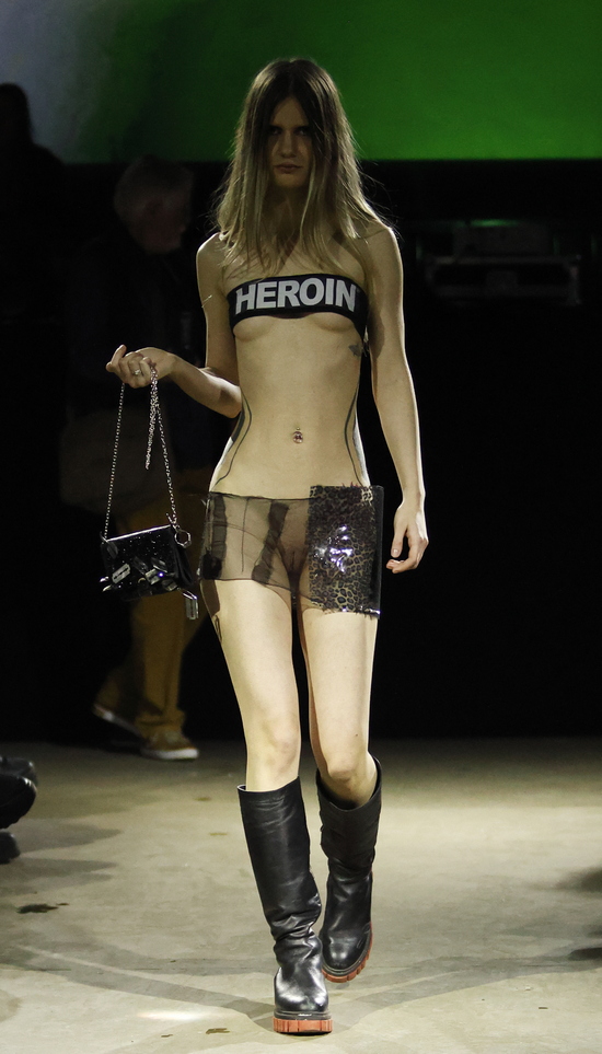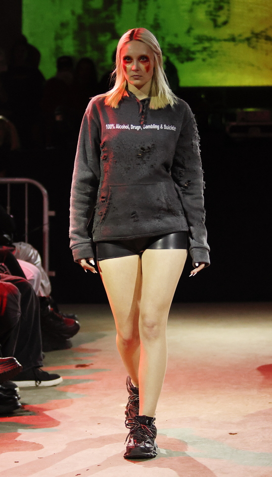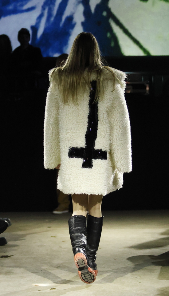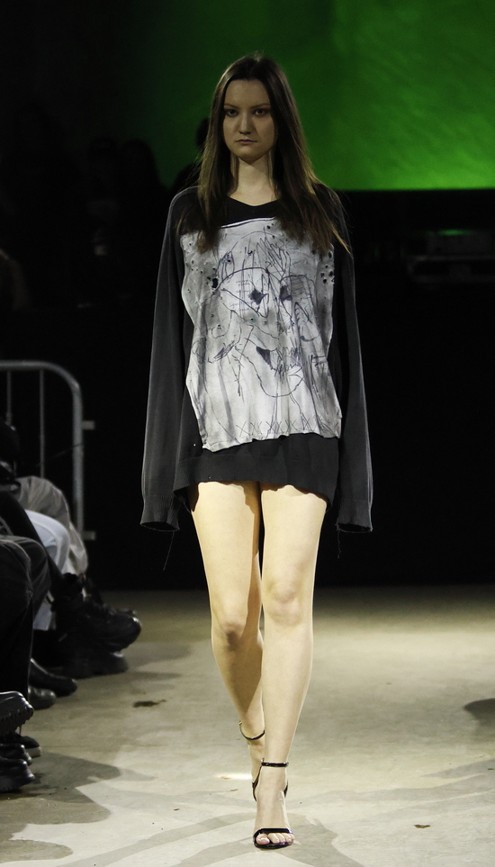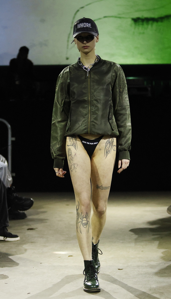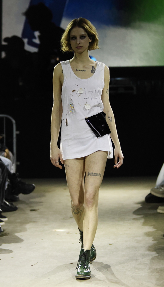 Die Entwürfe sind geprägt von applizierten Flächen mit Statement-Skizzen auf Tops bis hin zum Katzenbild, schimmernd metallischen Jacken, auch bauchfrei, und vielen schweren Stiefeln. Die Stoffe sind manuell bearbeitet, durchlöchert, oft asymmetrisch konzipiert. Es wird mit Transparenz gespielt und viel Haut gezeigt, bei einem wilden Materialmix. Das kommt greifbar und echt daher.