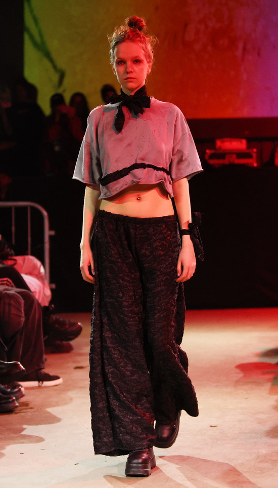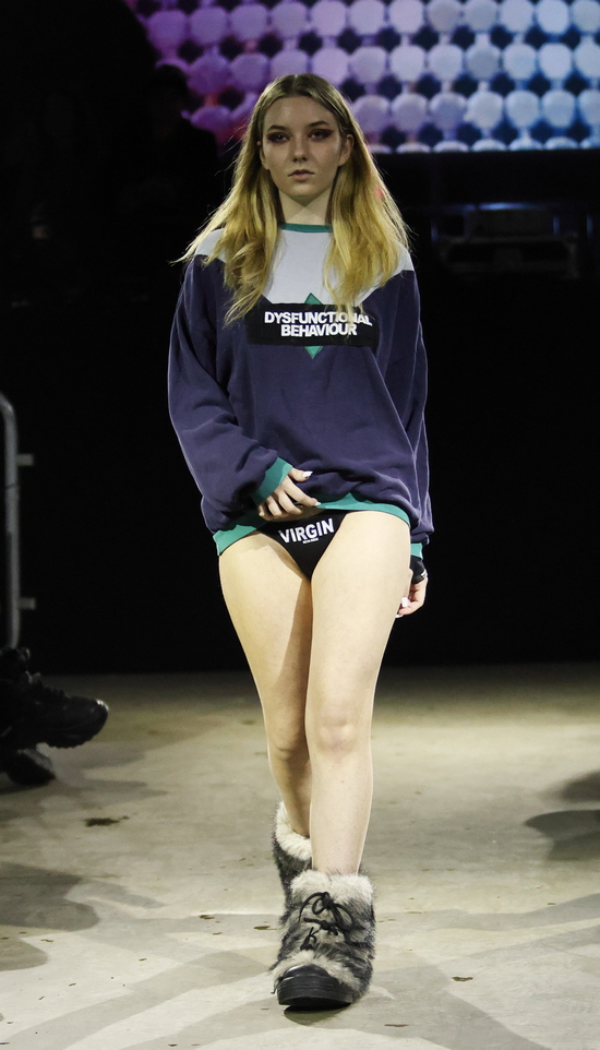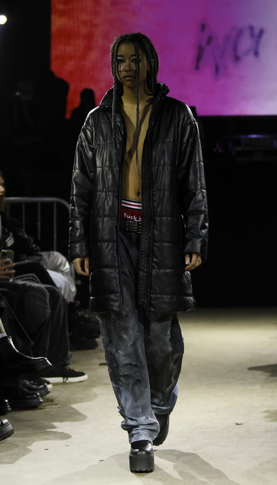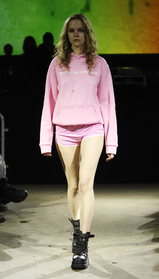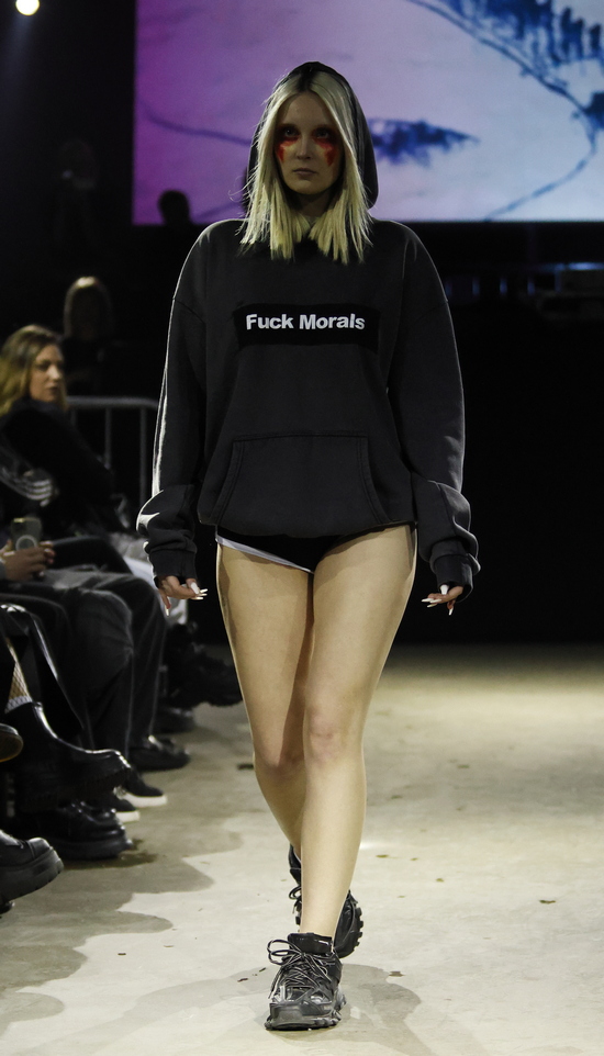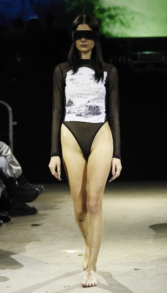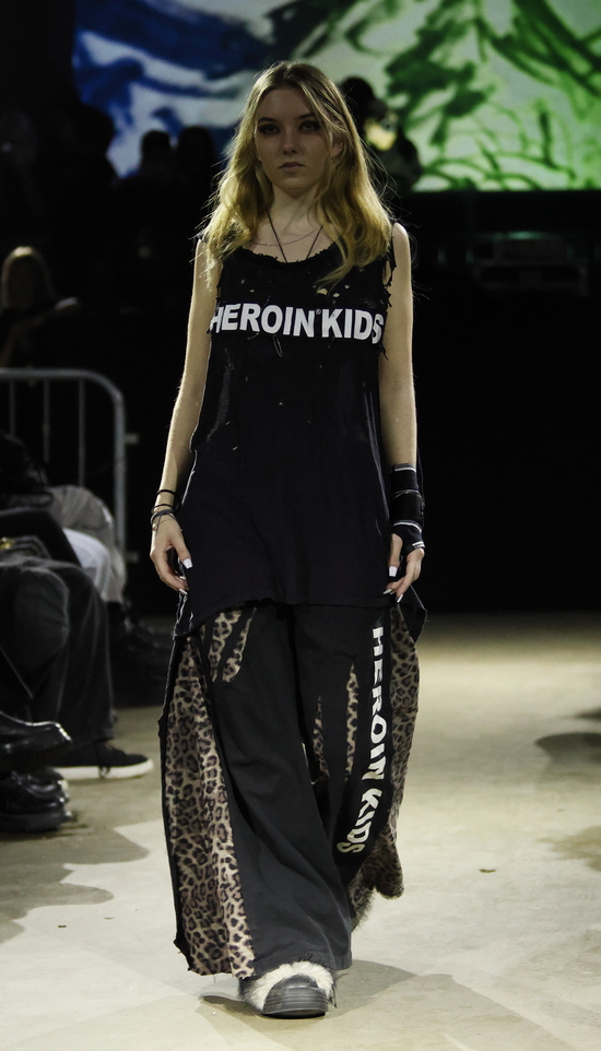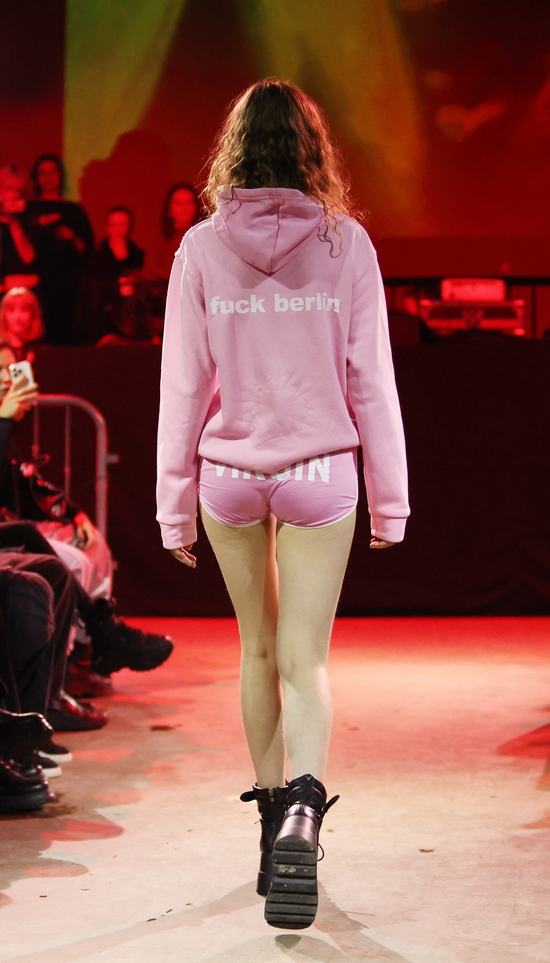 Das Berliner Label Heroin Kids von Christian Kaiser und Corinna Engel präsentierte passend in einem typischen Berliner Club. Wer in den 1990er Jahren seine Jugend verbracht hat, wird bei dem subversiven Hauch von Grunge schmunzeln und sich freuen, dass es diese Lebensart zwischen Provokation, Wildheit und sexueller Selbstbestimmung in einer durchkommerzialisierten Gesellschaft mit einem durchdringenden Instagram-Lifestyle als Gegenentwurf noch gibt. Wenn nicht in Berlin, wo sonst wäre sie so authentisch? Im Kern wird hier eine Sehnsucht nach Authentizität in einer Welt, die von Perfektionismus, Selbstoptimierung und digitaler Inszenierung geprägt ist, gezeigt. Menschen, die sich hiermit identifizieren, wenden sich bewusst von Hochglanzästhetik ab und suchen das Ungefilterte, das Unfertige, das Echte. Und das Eigene. Dysfunktionales Verhalten zeigt sich in Aussagen wie: „Ich mache nicht mehr alles mit“, was weniger aggressiv, dafür umso konsequenter wirkt.