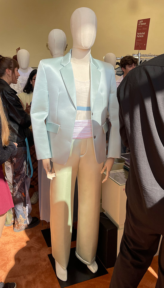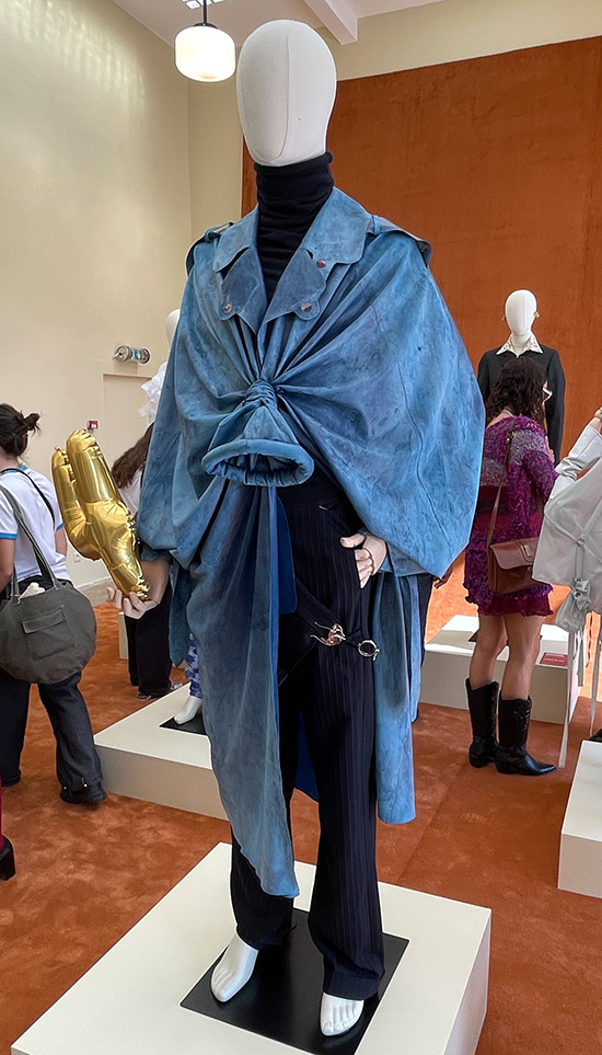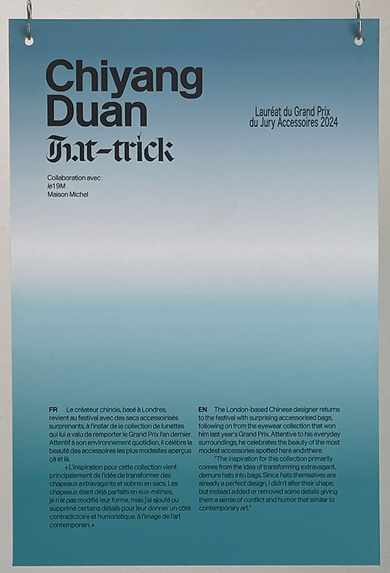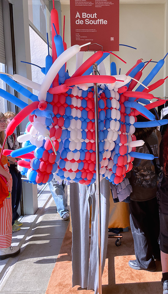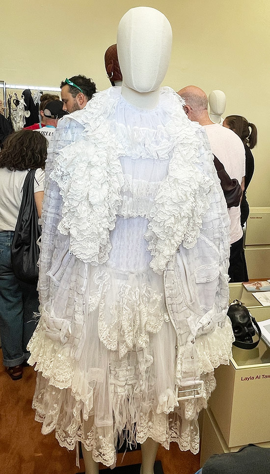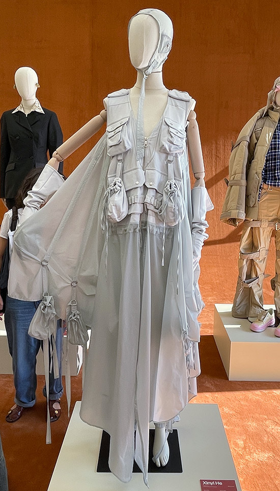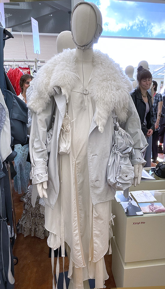 Es ist ein wesentlicher Aspekt des Wettbewerbs der jungen Designer und Designerinnen, ihre Arbeit dem interessierten Publikum selbst anhand ihrer Kollektion vorzustellen und zu erklären. Man kann die Beispiele von Nahem betrachten, befühlen und besprechen, hier wird quasi die Brücke geschlagen zwischen dem Anliegen der jungen Gestalter und dem interessierten Publikum, sei es den Profis oder den Konsumenten. Das ist eine wichtige Einrichtung des Festivals, identifikationsstiftend und erkenntnisgerichtet zugleich, der Ort, wo die Nähe zur Kunst und Kreativität auch grundlegend kulturstiftend ist. Bevor sie dann der Exklusivität und dem luxuriösen Showbusiness geopfert wird: schon im Folgejahr bekommt der Gewinner des Wettbewerbs eine offizielle Schau in der Pariser Fashionweek gesponsert, und da ist es dann vorbei mit der Bodenhaftung des kreativen Tuns. Dieser Veranstaltungsteil ist darum sehr beliebt beim interessierten Publikum und bei den Profis, die hier kaufen, Kontakte knüpfen und Qualitäten begutachten – entsprechend voll ist die auf gedrängtem Raum stattfindende Präsentation immer. Mit dem Ortswechsel dieses Jahr hat sich daran nichts geändert, aber der kann schon auch als Zeichen eines veränderten Focus‘ des Festivals verstanden werden.
