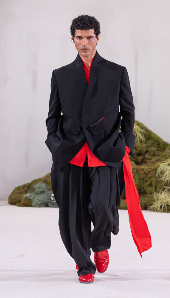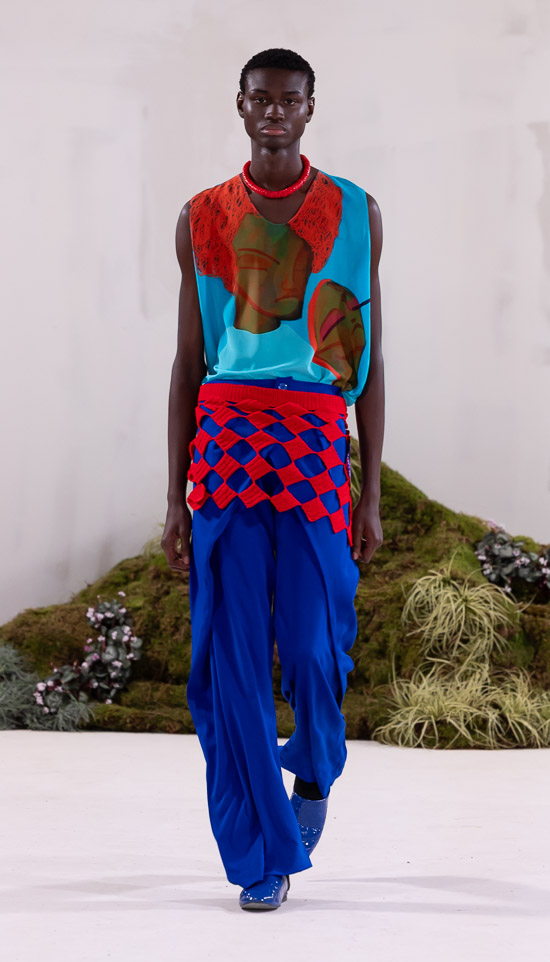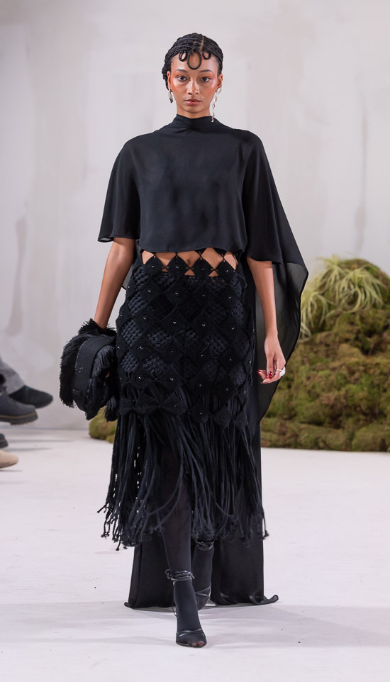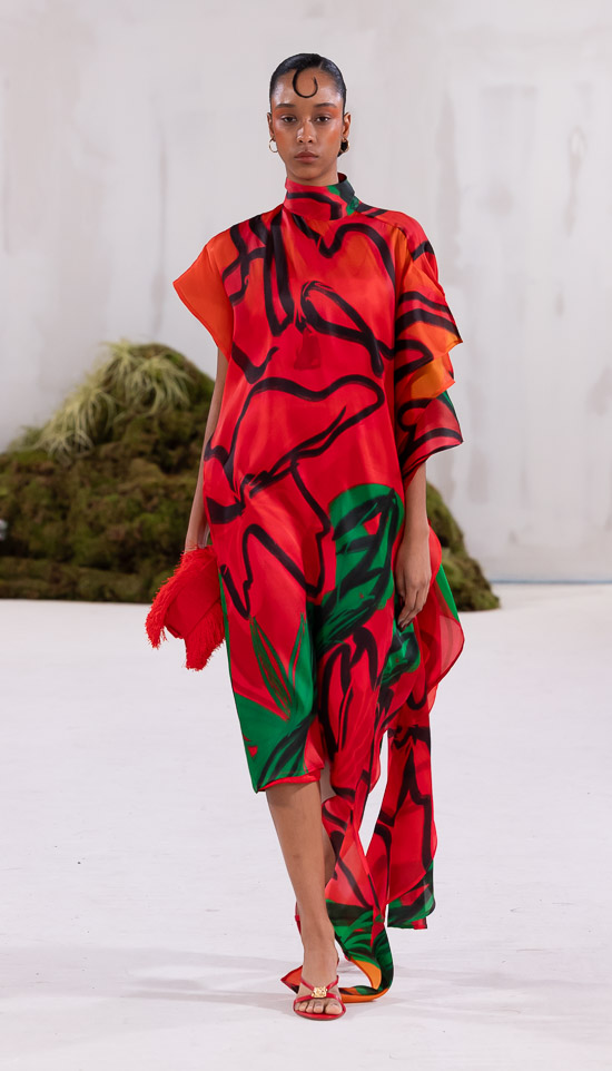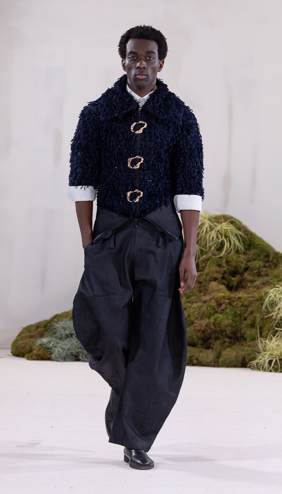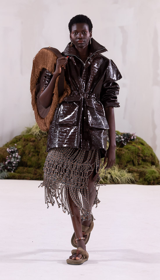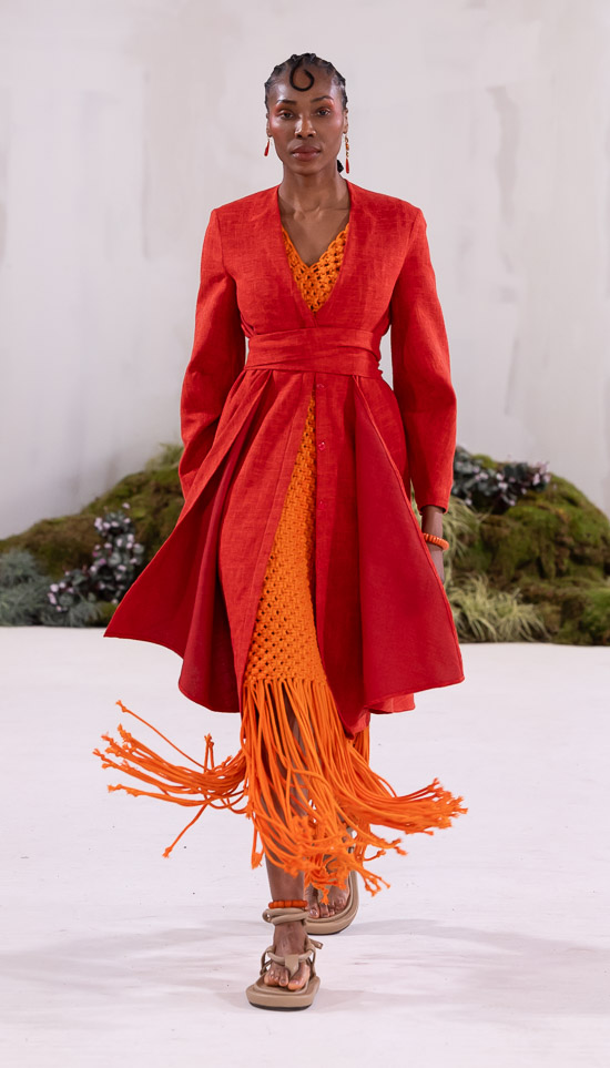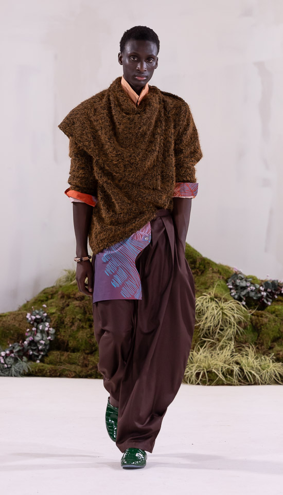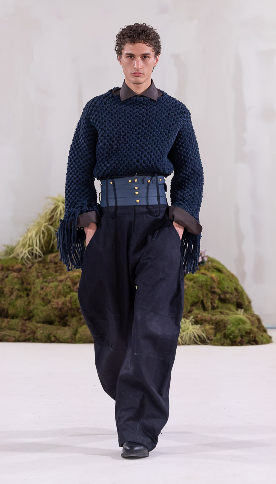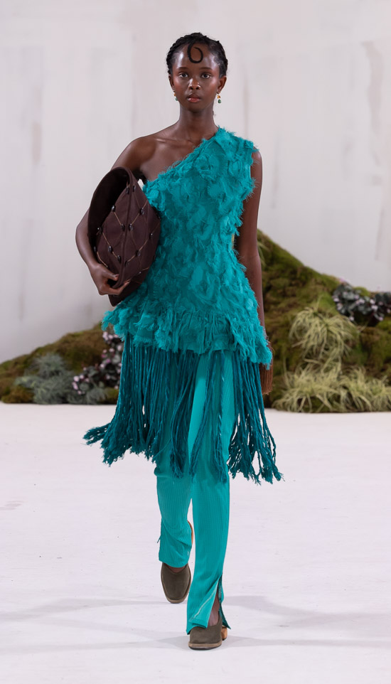 Im Prinzip ist die ästhetische und handwerkliche Verschmelzung zweier Kulturen also die hohe Kunst dieses Labels, dazu gehören des Weiteren die skulpturalen Schnitte, lebendigen Farbpaletten und sozialbewussten Erzählungen. Der praktische Fokus liegt bei dieser Kollektion auf spezifischen Handwerkskünsten und besonderen Texturen, was sich insbesondere in den zahlreichen Ton-in-Ton-Looks, Makramee- und Häkelkleidern, handgefärbten Stoffen, bunten Drucken, Fransenpullovern, handgefalteten Schlaghosen und gewebten Accessoires zeigt. Sehr komplexe, aufwändige Entwurfs- und Herstellungsweisen, die dann allerdings auch zum Begriff Luxusmode führen, womit der angestrebte Impact dann leider wieder geschmälert wird. Aber für eine überzeugende Modenschau spielt das ja eher keine Rolle.