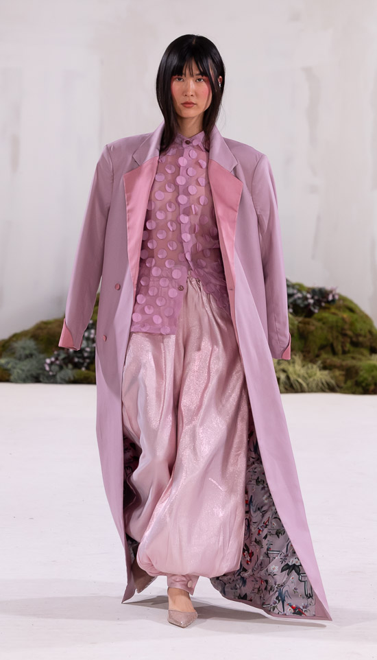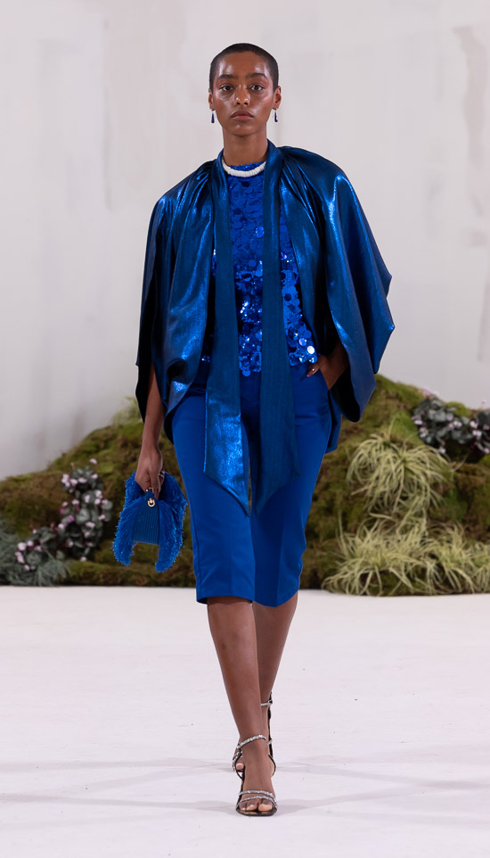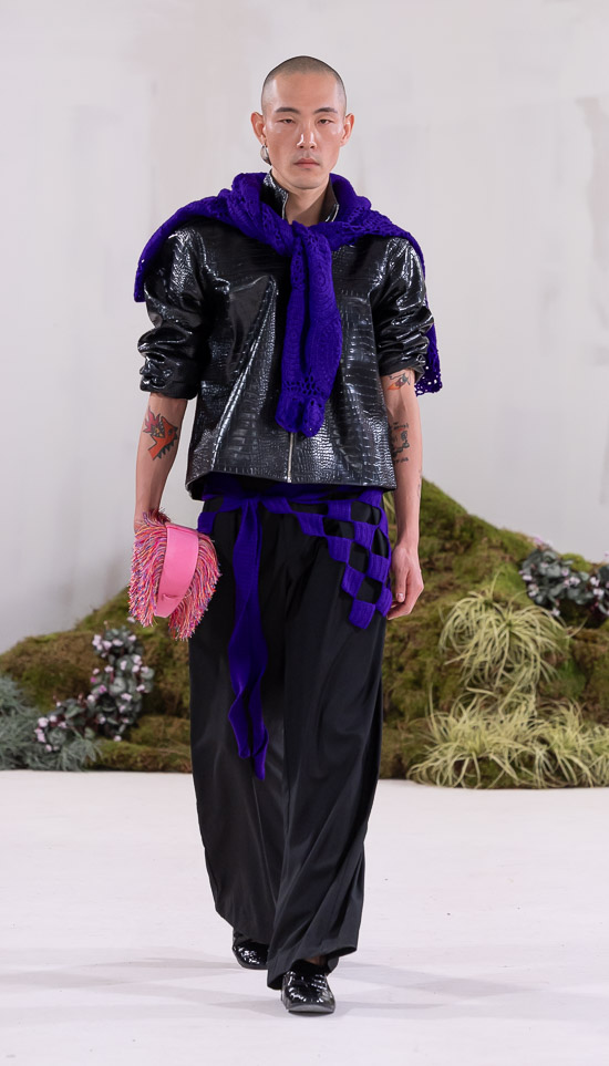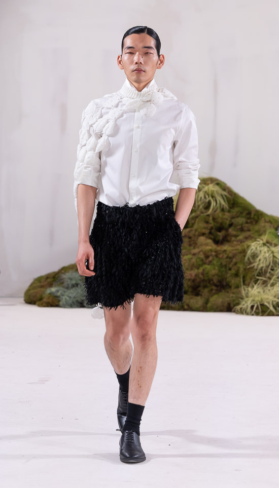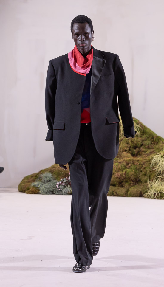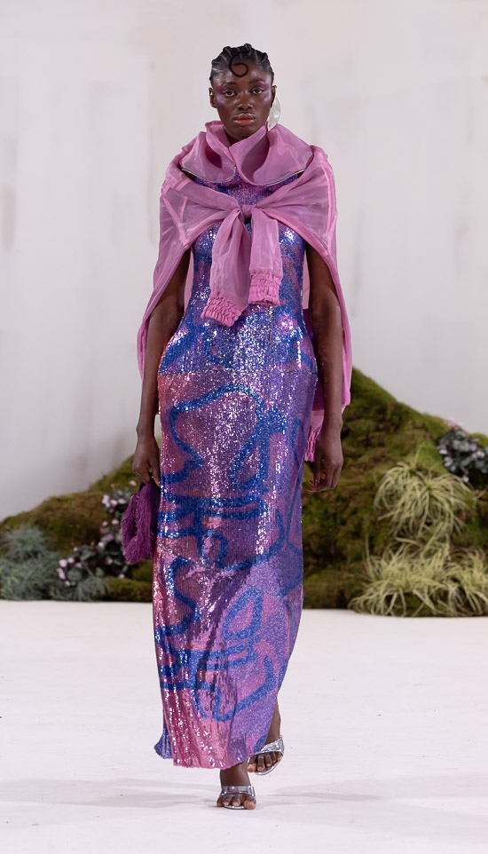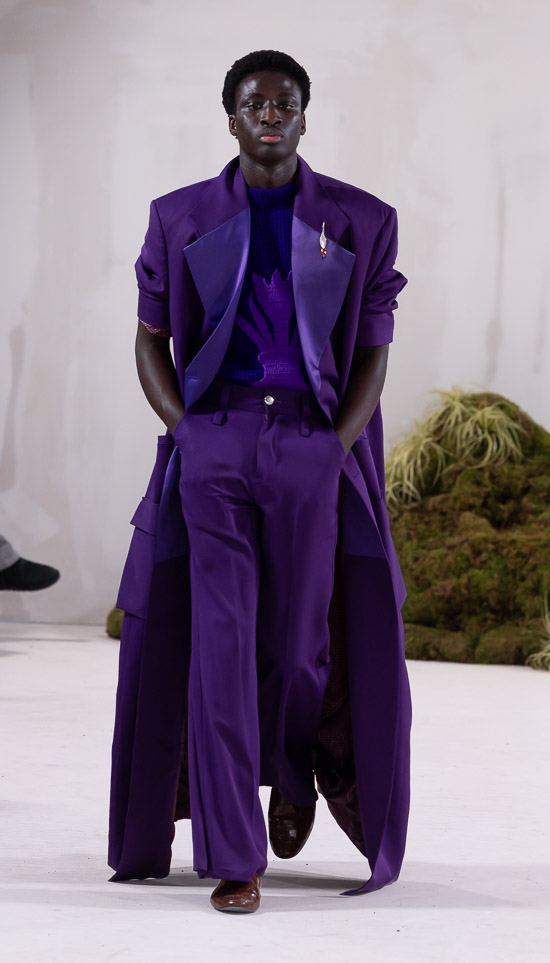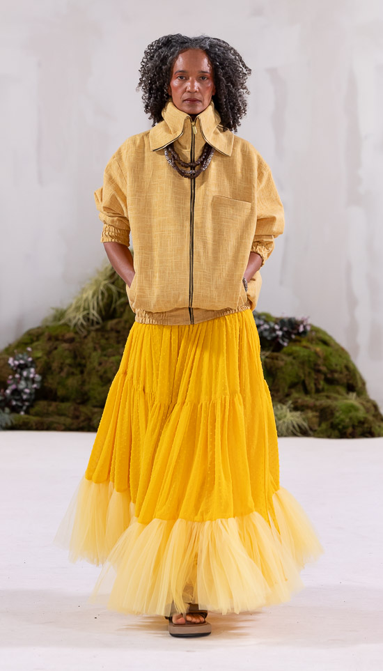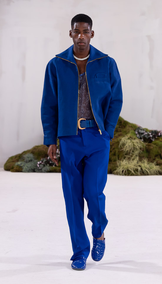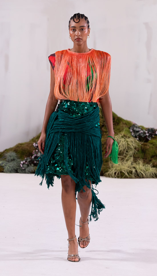 Im Prinzip ist die ästhetische und handwerkliche Verschmelzung zweier Kulturen also die hohe Kunst dieses Labels, dazu gehören des Weiteren die skulpturalen Schnitte, lebendigen Farbpaletten und sozialbewussten Erzählungen. Der praktische Fokus liegt bei dieser Kollektion auf spezifischen Handwerkskünsten und besonderen Texturen, was sich insbesondere in den zahlreichen Ton-in-Ton-Looks, Makramee- und Häkelkleidern, handgefärbten Stoffen, bunten Drucken, Fransenpullovern, handgefalteten Schlaghosen und gewebten Accessoires zeigt. Sehr komplexe, aufwändige Entwurfs- und Herstellungsweisen, die dann allerdings auch zum Begriff Luxusmode führen, womit der angestrebte Impact dann leider wieder geschmälert wird. Aber für eine überzeugende Modenschau spielt das ja eher keine Rolle.