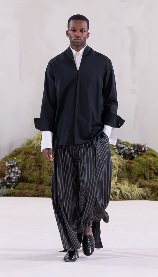 Wenn man Pressetexte liest, ist man geneigt, die Interpretation in die vorgegebene Richtung zu lenken („In seinen neuesten Entwürfen beschäftigt sich der Designer mit Themen wie Nostalgie, Kindheit und Orten (wie Hinterhöfen), die uns im Laufe der Jahre prägen.“ – daher der Titel) aber in diesem Falle scheint es doch auszureichen, seiner Begeisterung für Lebensoptimismus zu frönen, dafür muss man sich ja nicht zwingend in nostalgische Erinnerungen zurückbeamen. Unsere Zeiten brauchen optimistische Zukunftsmusik und diese Kollektion von Orange Culture kann man auch so herum verstehen. Umso mehr, als unsere Klischeevorstellungen klassischer afrikanischer Stoffe besetzt sind mit selbstverständlicher Buntheit, mit Wärme und mit positiv leuchtender Lebensfreude, aus einem stets sonnigen Land der vielfältigen Muster und Erscheinungsbilder. Diese Kollektion setzt auf zeitgemäße Weise diese tradierten Vorstellungen fort und transportiert eine Menge Inspiration, um die Stimmung der Modebilder der Gegenwart aufzuhellen. Dabei kommt die Kollektion mitnichten folkloristisch daher, vielmehr assimiliert und reflektiert der ursprünglich afrikanische Ansatz die westlichen Modeströmungen in souveräner Weise und führt auch gekonnt afrikanisches Kunsthandwerk mit westlichen Herstellungsweisen und Modevorstellungen zusammen, zu einer globalen Perspektive also, die in afrikanischer Kreativität verwurzelt ist. Diese ungebrochene, stimmige Einheit ist wunderbar gelungen: Mehr noch als hier sieht man in Frankreich viele Schauen mit afrikanisch stämmigen Designern, die in Paris ihre Ausbildung gemacht haben. Und da zeigt sich oft, dass eine ausgewogene, selbstverständliche Verknüpfung der Kulturen eben nicht oft homogen und überzeugend gelingt – es bleibt eher bei Beeinflussungen.