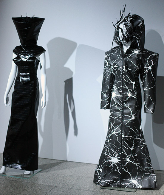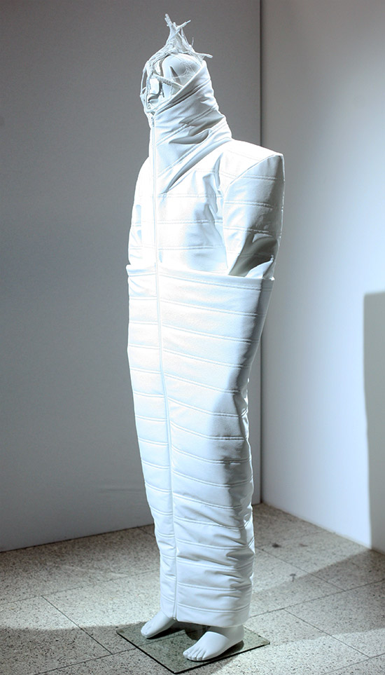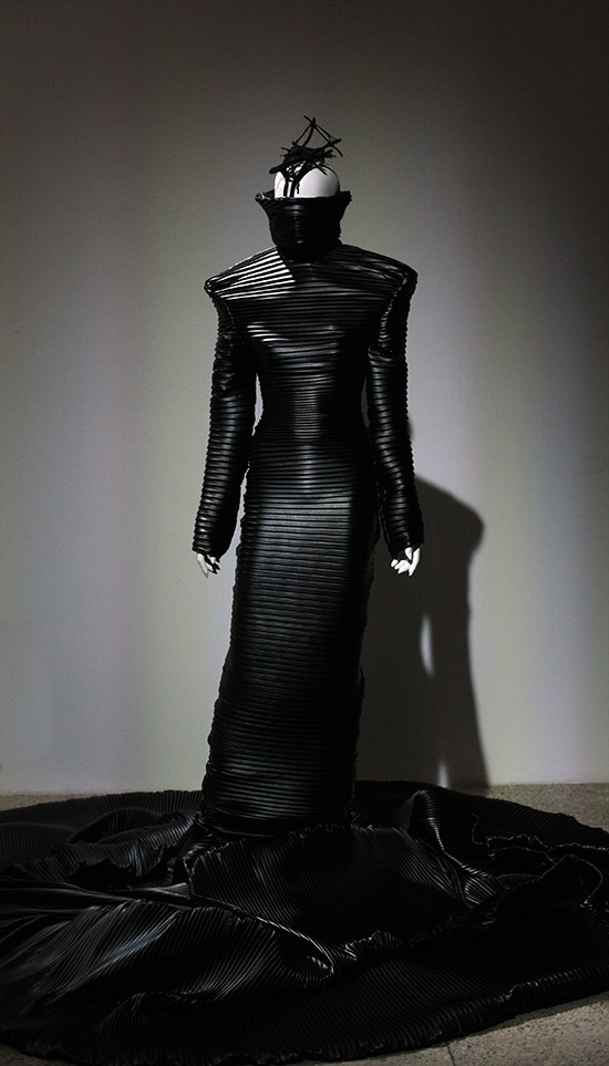 Die exzentrischen und auch futuristisch anmutenden Kollektionen von Maximilian Gedra verstehen sich als skulpturale Kunstwerke und sollen auch wie solche erscheinen. Sie sind eher selbstbezogen und darum als monolithische Positionierungen jeweils für sich gestellt. Man erwandert diese Arbeiten wie Kunst im Museum von Piece zu Piece, jedes eine selbstbezogene Inszenierung für sich, die höchstens mit Licht und bizarren Accessoires (vorwiegend Headpieces) intensiviert wird.