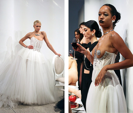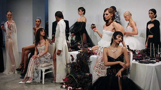 … where does the runway end. Am letzten Tag der Fashionweek wohl auch im RAUM.Berlin. Nachdem zwölf Designer an diesem Ort mit diesen Leitfragen ihre Kollektion mit experimentellem Format vorgestellt haben, wird deutlich, dass hier ein gutes alternatives Format kreiert wurde, das viele von ihnen optimal und kreativ zu nutzen wussten. Zu den spektakulären gehörte auch Karin Brettmeisters Ritual Unions mit einem tableau vivant, das wirklich Spass machte, sowohl den Darstellern als auch dem Publikum. Ein Bankett, angerichtet für Frauen, die in den edlen Dessous beziehungsweise Brautkleidern des Labels erscheinen. Ähnlich wie Bildwelten (und Lifestyle-Fantasien) von Ellen von Unwerth und von Agent Provocateur entwirft Ritual Unions hier eine lebendige Anschauung ihrer modernen, alternativen Braut- und Couture-Kleider, die fast übergangslos aus edlen Dessous erwachsen und genau an dieser Schnittstelle Individualität, Einstellung und Selbstdarstellung ansteuern. Schwerpunktmäßig ist die Kollektion an Frauen gerichtet, aber nicht ausschließlich, und sie feiert den vergnügten Eros der Weiblichkeit, der in der Produktion stets individuell ausgelegt wird. Das tableau vivant (lebendes Bild) war im ausgehenden 19. Jahrhundert groß in Mode und es dürfte, wenn es kreativ angelegt ist, durchaus als Leitformat für die RAUM.Berlin-Präsentationen attraktive Wiederauferstehung feiern. Wenn es gut war, war es allerdings auch sehr aufwändig, aber auf heute bezogen und verglichen mit schlicht inszenierten Runwayshows kann das die bessere Entscheidung für Modedesigner sein. Das verbundene Lebensgefühl lässt sich besser szenisch evozieren und im Vergleich zum oft eigentümlichen Schauen-Großaufwand der großen Luxusmarken auch überschaubar finanzieren.