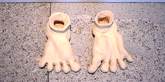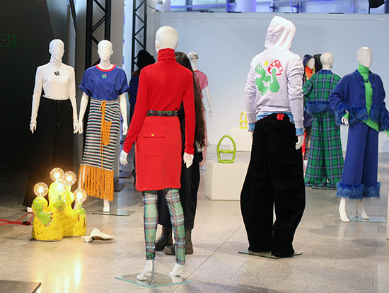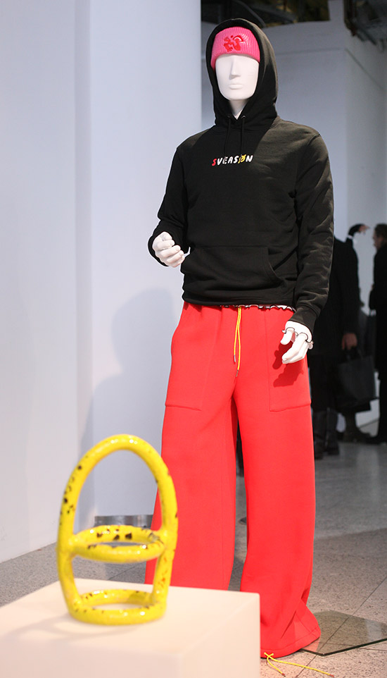 Das Label Sveasøn von Svea und Shirin aus Hamburg gibt sich dagegen vergnügt, kommunikativ und gestalterisch bodenständiger. Die Figuren bevölkern entsprechend locker verteilt den Raum, abwechslungsreich, muster- und farbenfroh. Zusammen ergibt sich für die Mode ein großer Mix aus Materialien, Gestaltcollagen, Mustern, fantasievollen Bildzeichen und auch kleinen Scherzen, der gute Laune suggeriert. Diverse handgetöpferte und bunte Objekte dazwischen verweisen auf unprätentiöses „Gestalten mit den eigenen Händen“ und ergänzen die Vorstellung von einem bunt-fröhlichen Leben.
